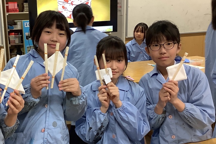 体験後、児童の日記には、「広げてみなければどんな模様になっているのか分からないので、ドキドキした。」「ハンカチの折り方やわりばしの止め方で模様が変わるのが面白かった。」と、その驚きや楽しさが綴られていました。