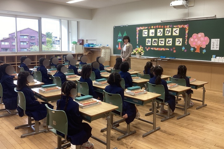 式では、校長先生と握手をして一人ひとりが挨拶を交わし、6年生が歓迎の気持ちを込めて校歌を披露しました。