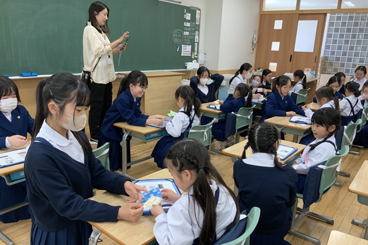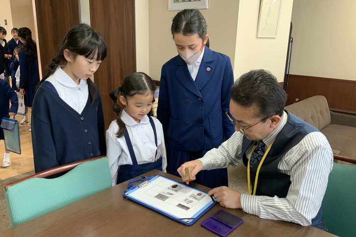 6年生が校舎内を案内しながら、椙山小学校のキャラクターである椙ニコちゃんのスタンプを集めました。お姉さんと話をしながら、楽しく学校のことを学ぶことができました。