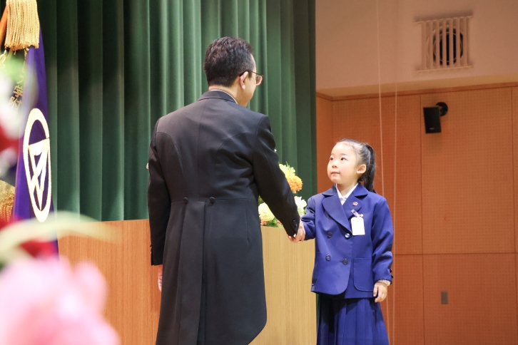 続いて、担任の先生に名前を呼ばれた新入生が一人ずつ壇上に上がり校長先生と握手する、本校恒例の挨拶を行いました。
