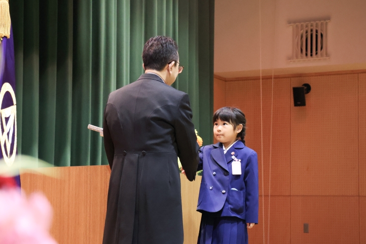 新入生代表の挨拶では代表児童が「お友だちをたくさん作ります」などの抱負を堂々と発表し、大きな拍手が送られました。