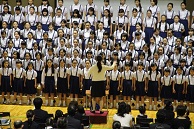 その後、体育館で全校児童が参加の皆さんを取り囲む形で合唱を行いました。以前、吹抜けで行った全校合唱のことを話して下さる保護者の方もいました。