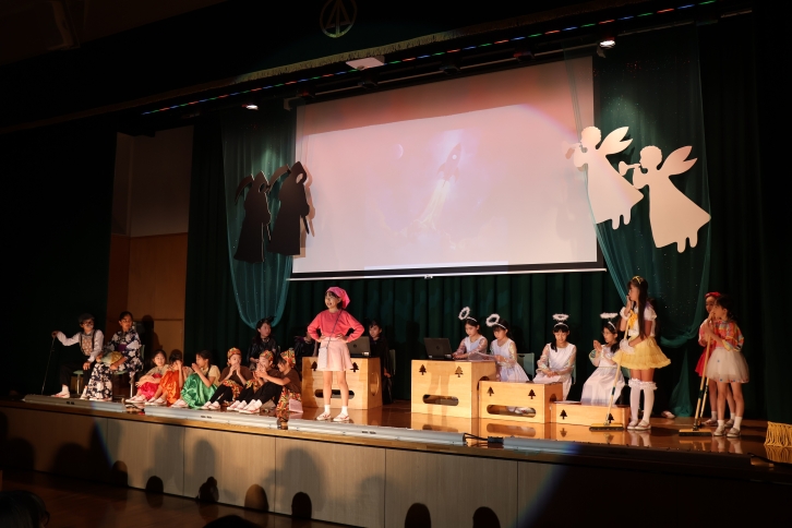 友達の大切さや命の尊さをテーマにした音楽劇。児童自身が照明係などの裏方にも挑戦し、高学年としての責任感と創造力が光る発表となりました。