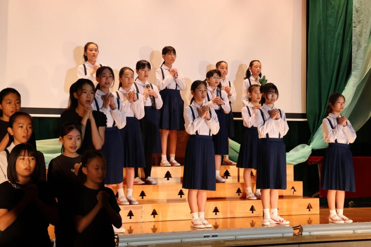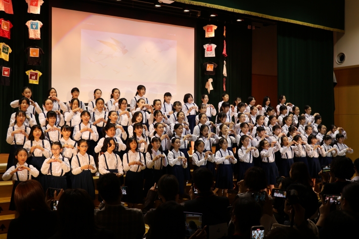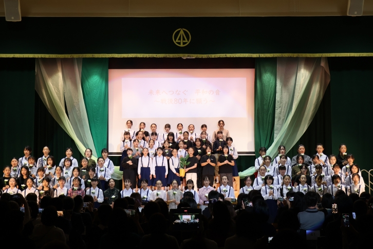 戦争の歴史から現在の平和への願いまでを児童自身が構成・演出した音楽劇。リコーダーやハンドベル、合唱を通して「平和の音」を表現し、最後には福山雅治さんの「クスノキ」の合唱で締めくくりました。椙山女学園中学校・高等学校の平和活動とも連携し、総合学園としての思いが込められた発表でした。