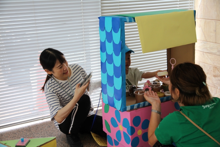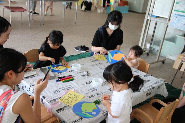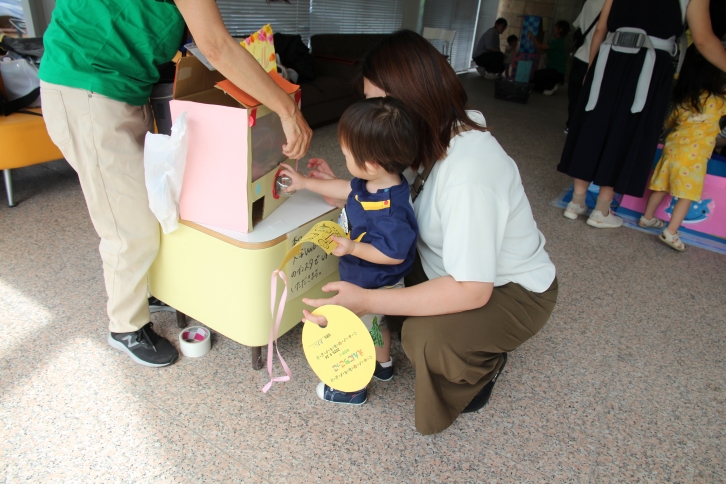 昨年は、アイス屋さん、フライドポテト屋さん、わなげ、水風船のヨーヨー釣りの屋台を準備しましたが、今回は、各コーナーを回りながら遊べるように、うちわづくり、さかなつり、ころころボール、フォトコーナーを準備しました!