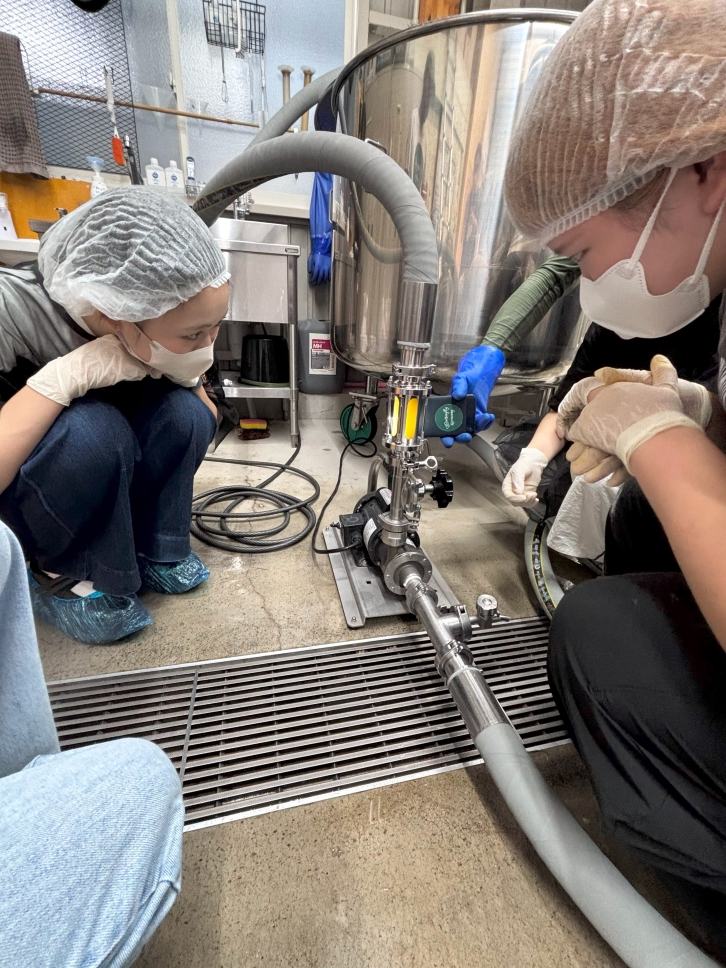 9月20日(土)、春日井市のバタフライブルワリーにて、学生たちが一日がかりで仕込み作業を行いました。麦芽の破砕から糖化、ホップ投入、ワールプールによる不純物除去まで、すべての工程を自分たちの手で体験。