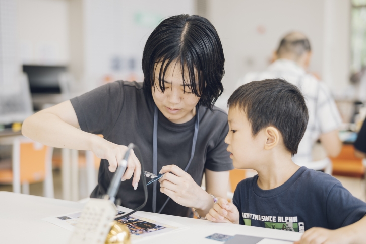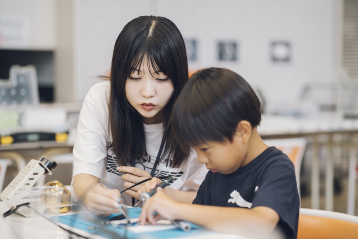 このイベントは、本学の情報デザイン学科(前:文化情報学部)や愛知淑徳大学、名古屋葵大学、名古屋文理大学など複数の大学の教員、学生、卒業生をはじめ、愛知県児童総合センター、民間企業の社員チーム、個人のワークショッパーさんが出展し、造形やアート、電子工作やプログラミングまで、20種類のワークショップを一度に体験できるイベントとして今年で12年目を迎えました。当日は、地域のご家族、出展者など約260名が集まりました。