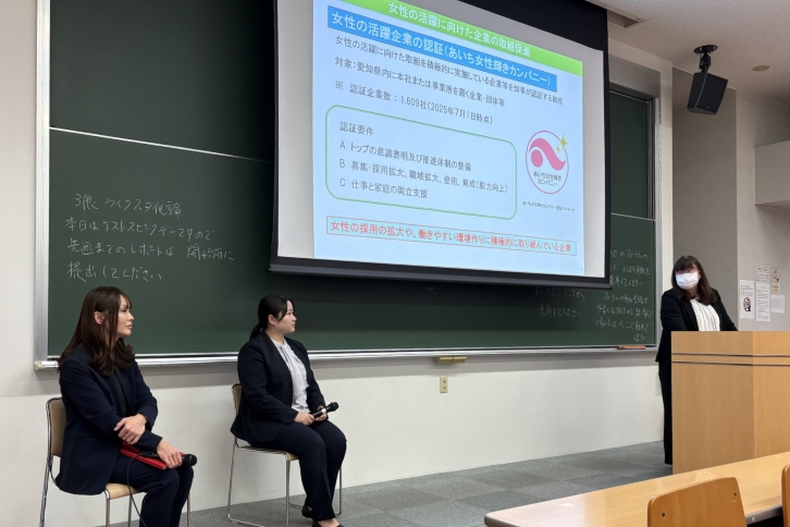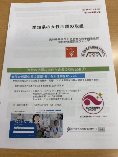11月5日(水)、人間関係学部の専門教育科目「ライフスタイル論」(担当:吉田あけみ教授)で、「あいち女性輝きカンパニー」のPRイベントが行われました。