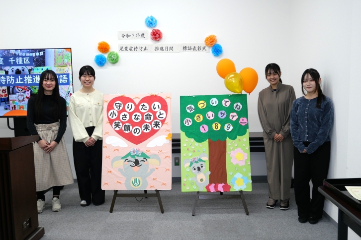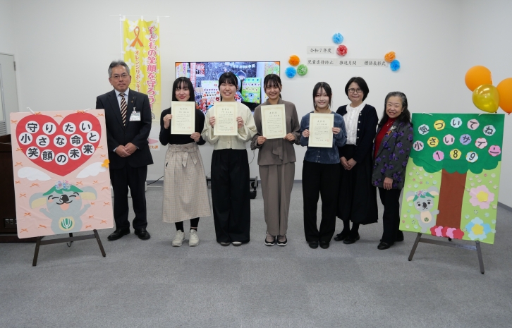 11月26日(水)、名古屋市千種区役所で「オレンジリボンキャンペーン(児童虐待防止推進月間)」の標語表彰式が行われ、教育学部の学生が千種区長から表彰状と記念品を受け取りました。