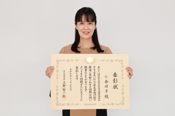 11月27日(木)、愛知県庁本庁舎(名古屋市中区)で行われた伝達式において、人間共生学科の小倉祥子教授が「人材開発行政関係功労者厚生労働大臣表彰」を受賞しました。