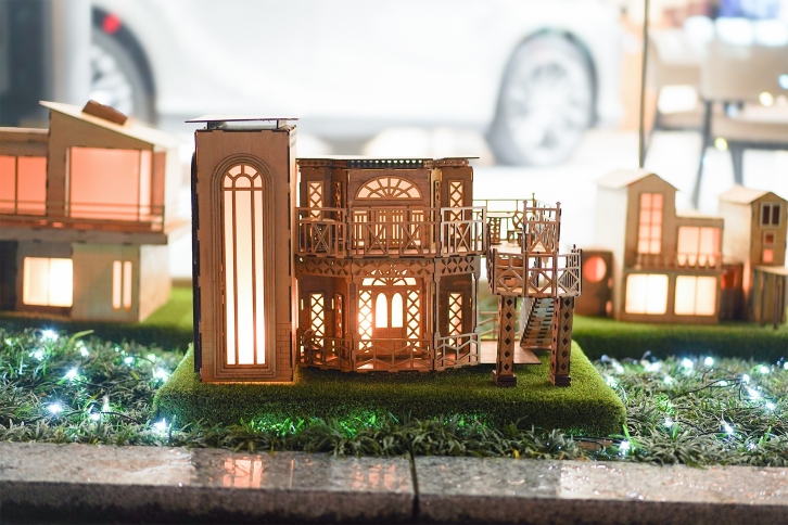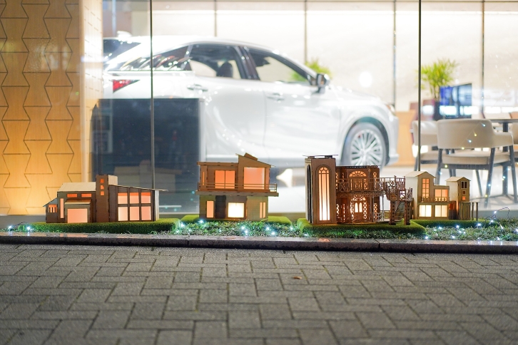 生活環境デザイン学科が、トヨタモビリティ東名古屋株式会社との産学連携で、自動車ディーラー「レクサス星が丘」のクリスマス装飾で使用される木製家形イルミネーションを制作しました。