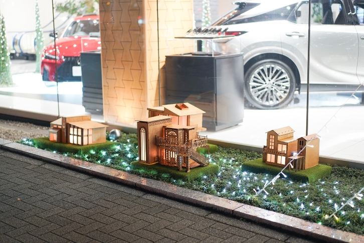 また、設置場所がレクサス販売店であることを意識し、木製車型イルミネーションの制作にも挑戦しています。