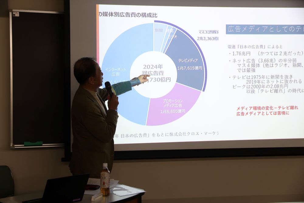 講義では、日本のテレビ広告の歴史的な経緯、変遷から現在の課題まで、幅広い内容が扱われました。日本では戦後まもなく民間放送が発足し、NHK(公共放送)と民間放送が共存共栄する独自の二元体制が確立されました。民間放送は広告収入を基盤としており、番組の合間に流れるCMは私たちの日常に溶け込んでいます。近年、インターネット広告の規模がテレビを上回りましたが、テレビ広告は依然として大きな存在感を持っています。