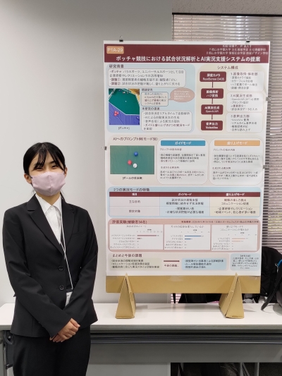 | 【研究テーマ】ボッチャ競技における試合状況解析とAI実況支援システムの提案 【発 表 者】和田 彩葉、向 直人 |