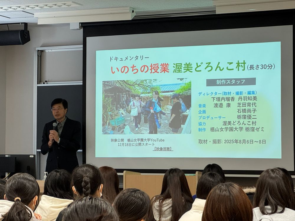 12月18日(木)、教育学部で「ドキュメンタリー いのちの授業 渥美どろんこ村」の公開記念イベントを開催しました。会場には教育学部生を中心に約170名が参加し、自然と命のつながりをテーマにした映像を鑑賞しました。