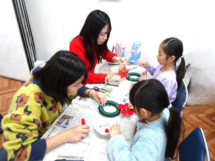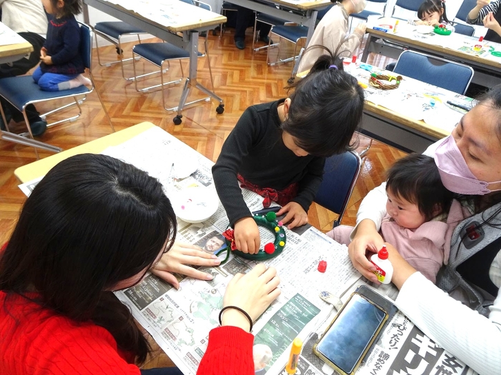 まずは、発泡スチロールのリングに、グリーンのリボンや毛糸を巻き付けて、リースのベースを制作。そこに、サンタクロースや雪だるまなどの小さな人形、カラフルなリボンやモール、松ぼっくりやベルなどの飾りを接着剤でくっつけて、デコレーションしていきます。保護者や学生たちと一緒に、子どもたちは自由な発想で、思い思いのクリスマスリースを作っていきました。上手にできて嬉しそうな子どもたちを見て、学生も笑顔になっていました。