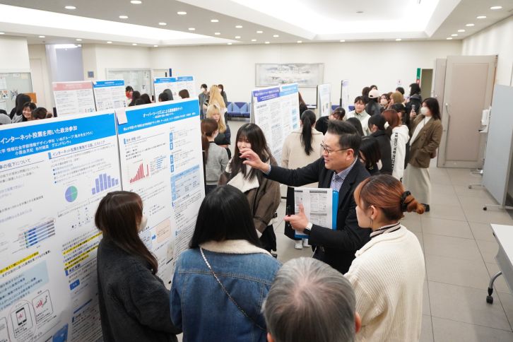 12月13日(土)、情報デザイン学科の「基礎演習」でポスター発表会を実施し、1年生が社会課題をテーマにしたアイデアソンの成果を、プレゼンテーションとポスターで発表しました。