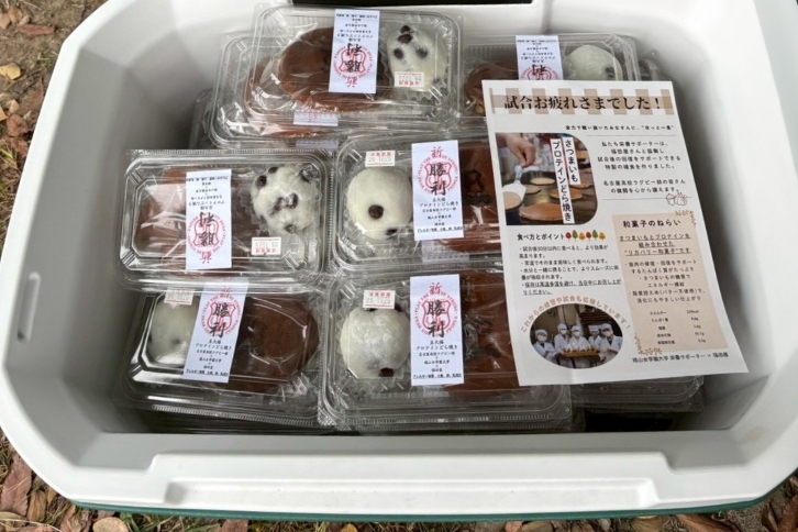 管理栄養学科の有志の学生が名古屋高等学校のラグビー部の高校生に、試合後の体の回復をサポートするリカバリー和菓子「さつまいもプロテインどら焼き」を提供しました。