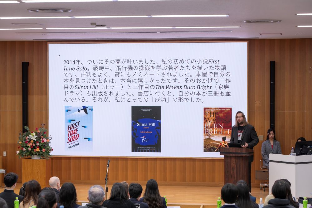 コンテスト当日は、外国語学部の教員であり、作家としても国内外で活躍されているイアン・マローニ先生による特別講演も実施されました。マローニ先生は、作家としての経験や、過去に生きた人々の知見、そして椙山女学園大学のタグライン「私を選ぶのは、わたし」を踏まえながら、「成功とは何か」を問いかける講演を行い、参加者に強い印象を残しました。参加者からも多くの質問が寄せられ、活発な講演会となりました。