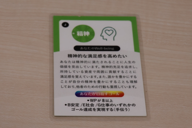 2人1チームで、それぞれにまず「プレイヤー」、「アクション」、「マネー」、「ウェルビーイングポイント」の4種類のカードが配付され、各チームは「プレイヤー」のカードに記載されている「キャラクター設定(個人の価値観)」と「目指すゴール」を目標に、「アクションカード」に記載された選択肢をもとに、「どこにマネーを使うか」をチームで話し合いながらゴールを目指します。
