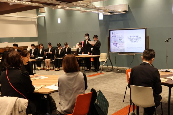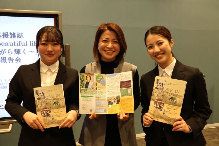 1月8日(木)、現代マネジメント学科・東珠実教授のゼミに所属する3年生が、ユタコロジー株式会社(名古屋市)と協働で制作してきた就活応援雑誌『Work in beautiful life~働きながら輝く~』(最新号)の完成を記念し、取材・制作に協力いただいた企業を招いて完成報告会を開催しました。