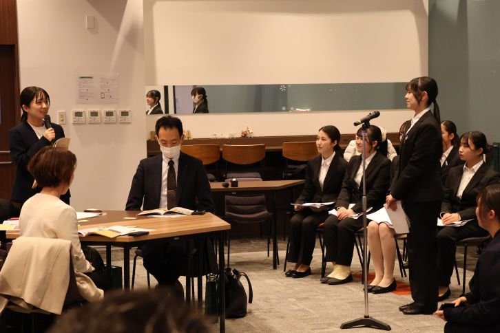 報告会には9社14名が参加。黒田学長と東教授の挨拶に続き、学生が取材で得た学びやキャリアへの意識の変化を発表しました。各発表の後には企業から感想が寄せられ、「第三者の視点で会社の魅力を再認識できた」「自身の仕事を振り返る機会となり、学生とともに成長できた」といったコメントがありました。