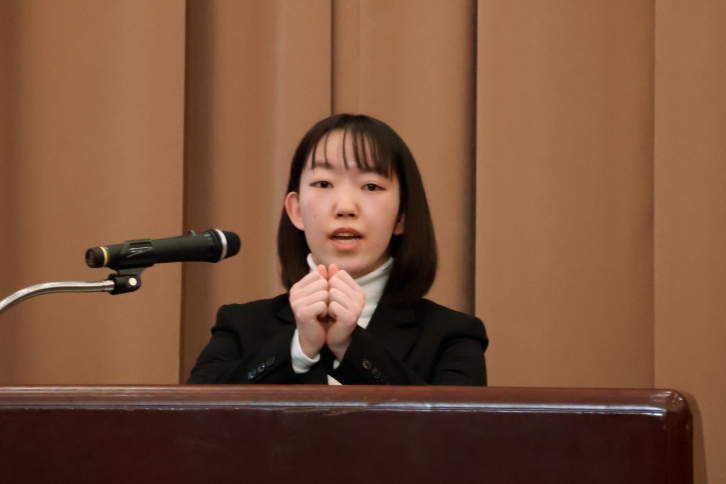 猪飼さんは「米の輸出で食料安全保障による平和を実現しよう」を演題に弁論を行い、令和の米騒動と呼ばれるコメ不足と、その原因となる食生活の変化。また、日本の人口減少による需要の激減、減反政策の影響について述べた上で、米の安定供給のためには国内市場だけでなく輸出による増産が不可欠であり、日本の米の品質や価格面での優位性を活かした輸出促進策を提案しました。日本の米が世界に行き渡れば食料安全保障として平和な世界の実現にも貢献出来ることを示しました。