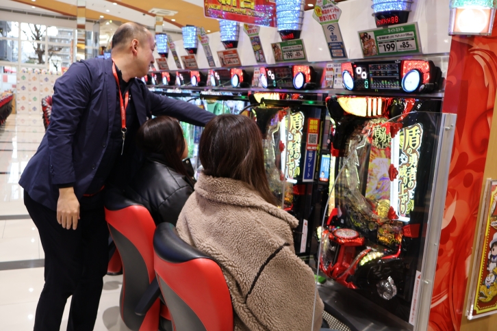 学生たちはパチンコにも挑戦し、機器の使いやすさや技術で玉を入れるという遊戯性、さまざまなキャラクターとコラボしたエンターテーメント性や快適な店内環境を体感しました。