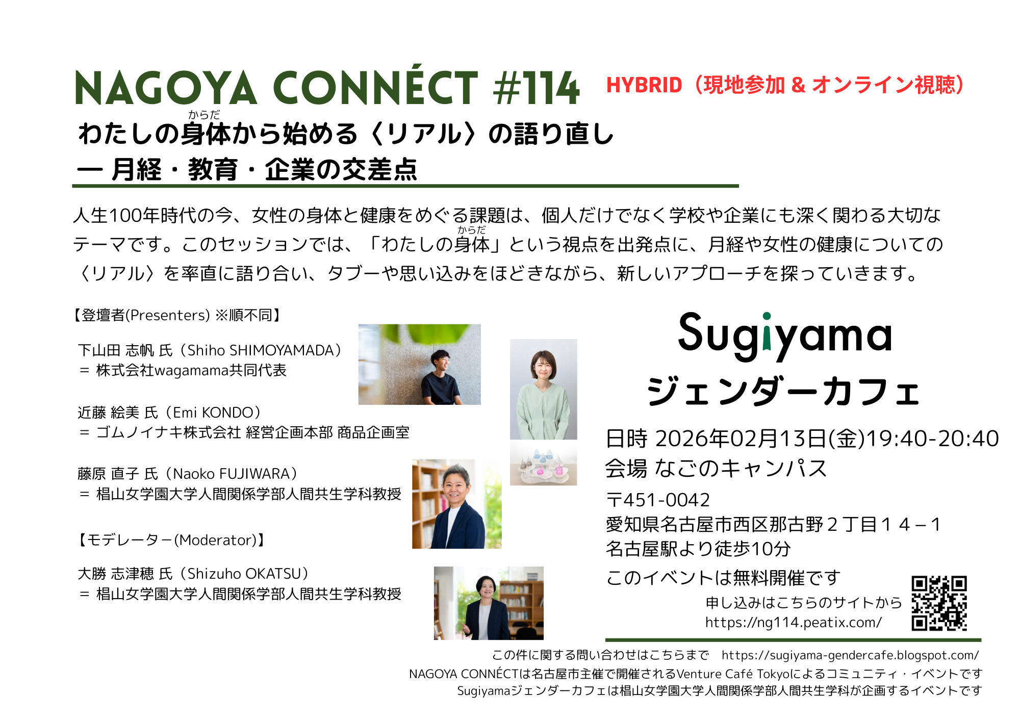 2月13日(金)に Sugiyamaジェンダーカフェ「わたしの身体(からだ)から始める〈リアル〉の語り直し— 月経・教育・企業の交差点」を開催します。