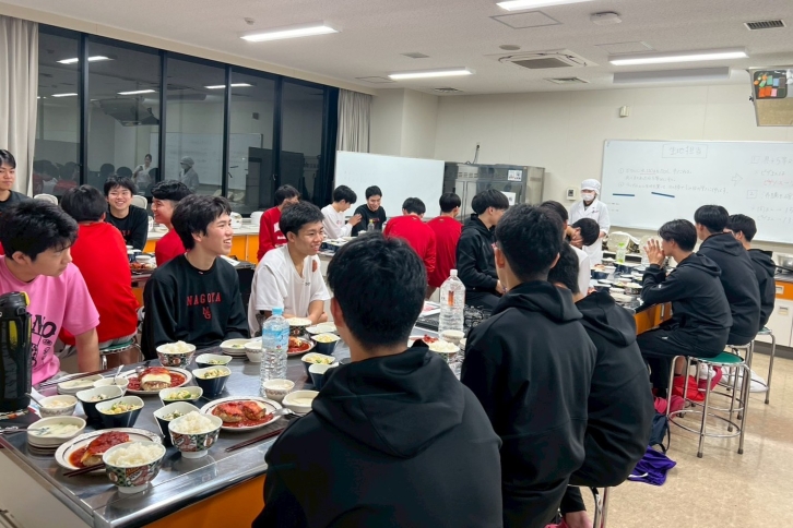 管理栄養学科の学生が、名古屋高校バスケットボール部の校内合宿に参加し、スポーツに必要な栄養を摂取できるように考えた特別メニューの夕食を提供しました。疲労回復や体づくりを意識し、クリスマスにも合わせた料理を用意。食事のサポートを通して選手を応援しました。