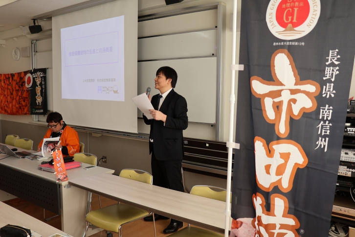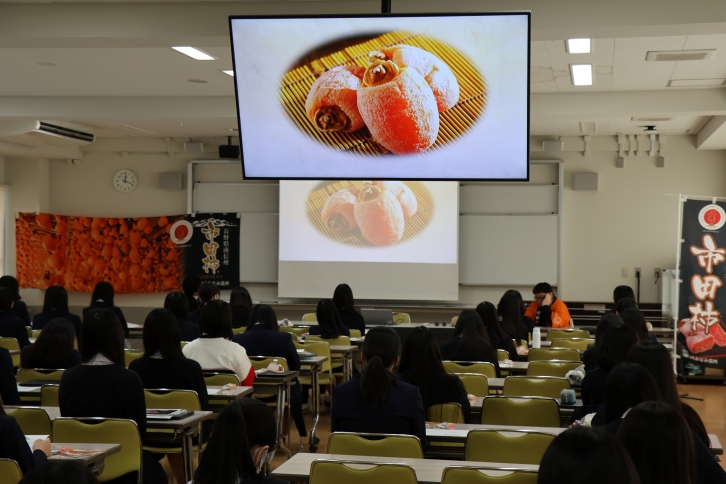 1月22日(木)・23日(金)、椙山女学園高等学校にて、高校3年生の選択科目「食物」履修者124名を対象に、全国トップの干し柿産地として知られる長野県の名産「市田柿」をテーマにした特別講義を実施しました。当日は、JA全農長野の小林氏とJAみなみ信州の米山氏を講師にお招きし、産地のプロフェッショナルから直接学べる貴重な機会となりました。