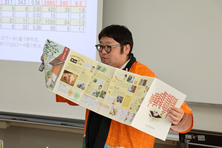 講義では、市田柿ならではの特徴や伝統的な製造方法に加え、品質を守り続けるためのブランド管理や知的財産としての保護の取組など、地域産業の深い学びが広がりました。講師の米山氏は「特に若年層への消費者拡大が課題。高校生のみなさんに市田柿を知ってもらい、実際に味わってほしい。」と語りかけ、市田柿について紹介しました。