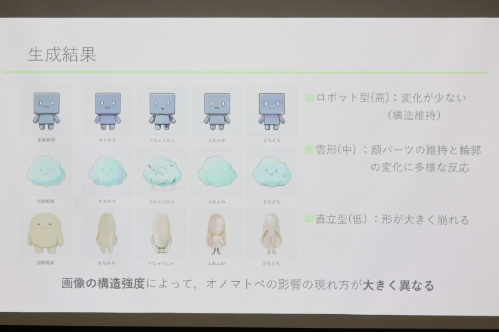 「ふわふわ」「キリッ」「もふもふ」などのオノマトペ(音や感覚を表す言葉)を入力することで、キャラクタの見た目や雰囲気がどのように変わるのかを生成AIを使って分析した研究では、実際に生成された画像を見せながら発表があり注目を集めました。
