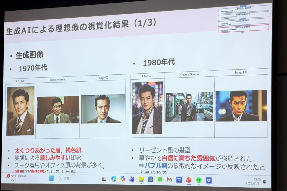 ほかには、時代ごとに「イケメン(理想の男性像)」のイメージがどう変わってきたのかを、文章データから分析し、AIで人物像として表現する研究が報告されました。データから社会の価値観の変化を読み取る面白さが伝わる内容でした。