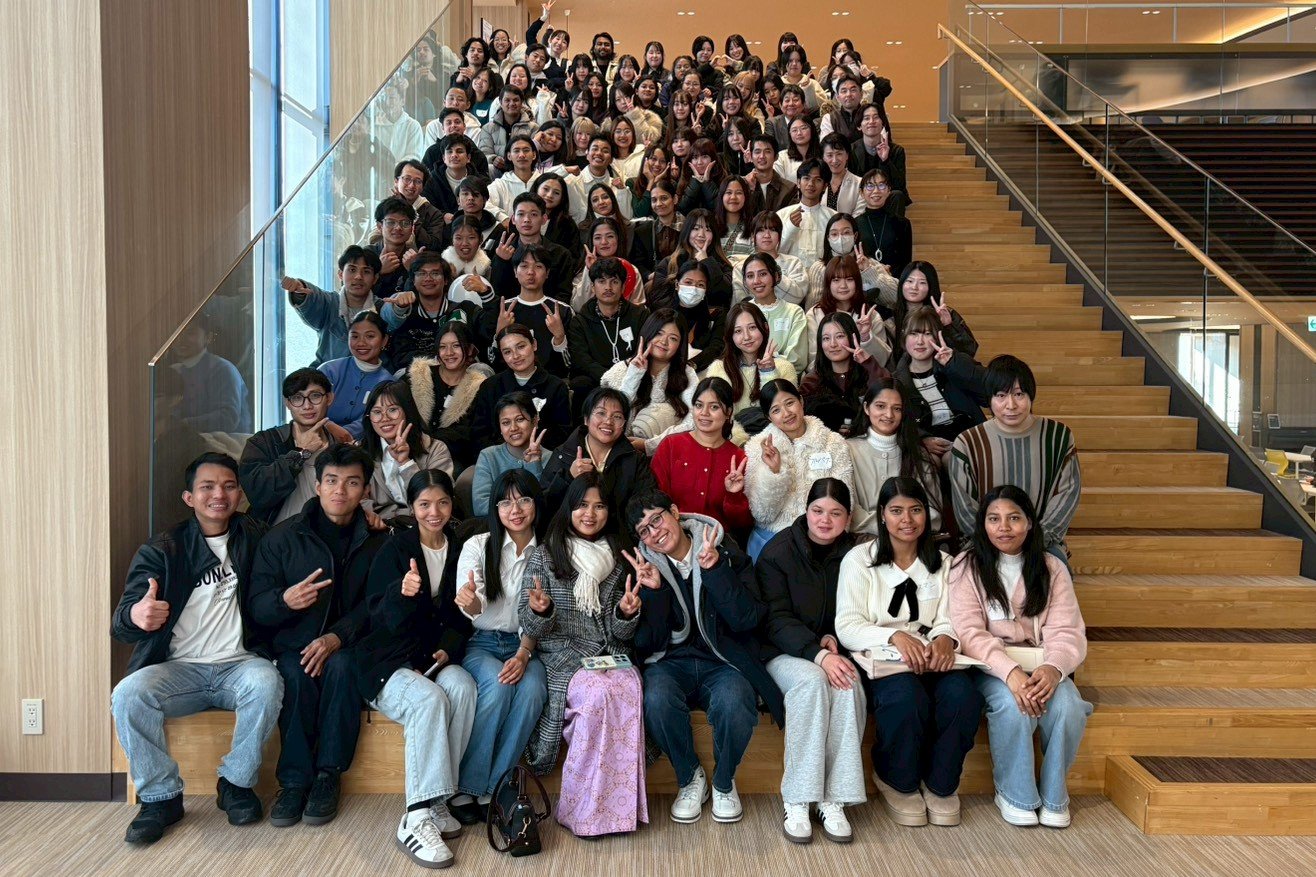 2月9日(月)、愛知学院大学名城公園キャンパス(名古屋市北区)において、椙山女学園大学・愛知学院大学・中部学院大学の3大学による合同日本語交流イベントに参加しました。当日は、中部学院大学で日本語を学ぶ留学生約90名、愛知学院大学日本語教師養成課程の受講生約30名、本学からは「日本語学概論B」「日本語文法B」(教育学部・村井宏栄准教授)および「日本語教育方法論B」「日本語教材・教具研究B」(小原亜紀子講師)を受講する学生約20名が参加し、総勢約140名が集う大規模な交流の場となりました。