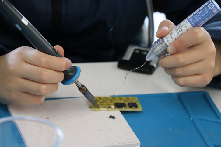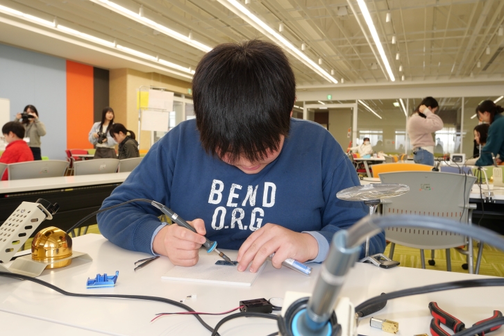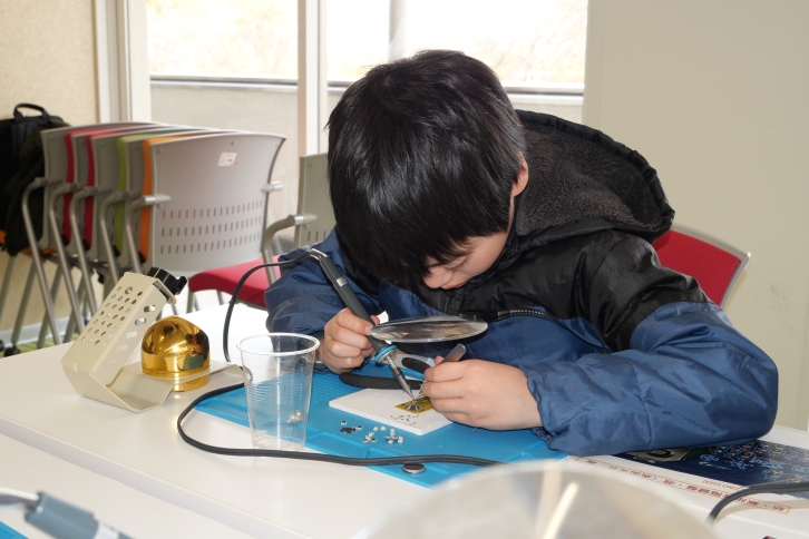 「電子工作」では、オリジナルの基板に小さなライトや電子部品を取り付け、光るアクセサリーを制作。子どもたちは楽しみながら、ものが光る仕組みや電気の働きに触れることができました。