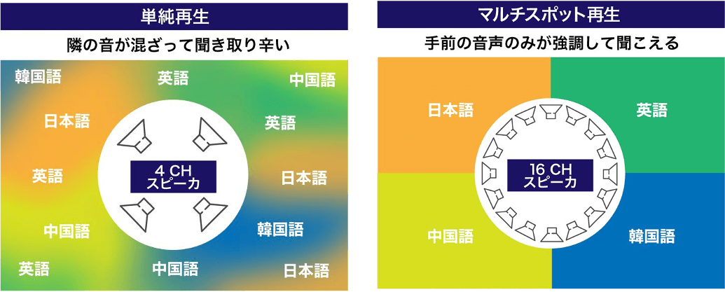 本技術は、国立研究開発法人情報通信研究機構(NICT)が開発した革新的な音響制御技術です。特定のエリア(スポット)ごとに異なる音声を再生し、隣接する音声と混ざることなく、必要な場所にのみ明瞭な音声を届けることができます。従来の多言語単純再生では、複数言語の音声が空間内で混在し、聞き取りづらくなるという課題がありました。しかしマルチスポット再生では、聞き手が立つ位置に応じて音声が明確に分離されるため、同一空間内で複数言語の情報を同時に提供することが可能となります。