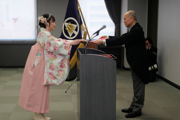 式典は、金剛鐘の演奏の後、静かに開式。会場は卒業生および修了生の期待と喜びが広がり、大学生活の節目を迎える特別な時間となりました。続いて行われた学位記授与では、各研究科・学部の代表者が、黒田由彦学長から学位記を授与されました。黒田由彦学長は式辞の中で、これから社会へ羽ばたく卒業生に向けて次のようにエールが送られました。「人生では学び続けることが大切です。社会に出て新しいことを学びたいと思ったときには、いつでも大学に戻ってきてほしい」この言葉には、大学が卒業後も学びの場であり続けたいという思いが込められています。卒業生たちは学長のメッセージに耳を傾けながら、これからの未来に思いを巡らせていました。