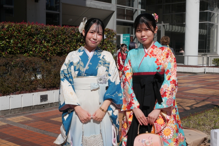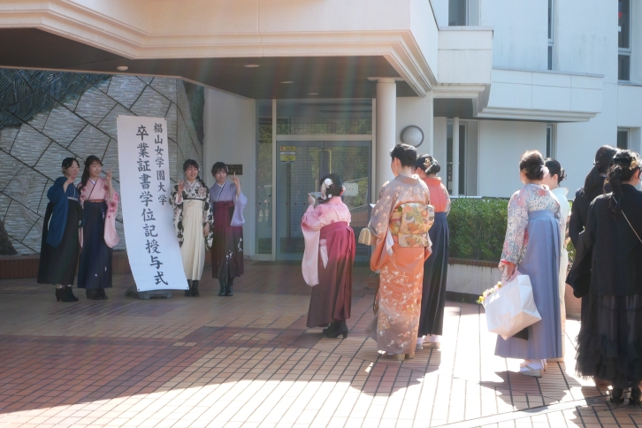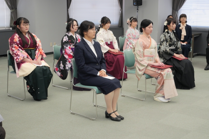 大学生活での学びや仲間との出会いへの感謝、そして未来への決意が込められた言葉に、会場は温かな雰囲気に包まれました。式典終了後、各授与室では学位記や卒業記念品が手渡されました。学生たちは友人や教職員と写真を撮ったり、言葉を交わしたりしながら、卒業の喜びを分かち合いました。