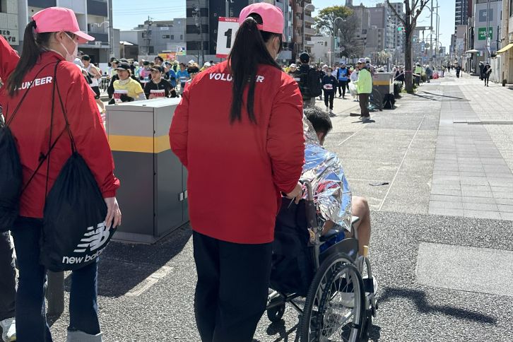 大会当日の主な任務は、コース上での傷病者の車椅子搬送です。ランナーの疲労や転倒に備え、注意すべきポイントや状況に応じた対応方法を確認した上で現場に入りました。医師や看護師、消防職員など多職種と連携しながら大会を支える仕組みを目の当たりにし、日頃の学びが実際にどのように活かされるのかを実感できるよい機会となりました。
