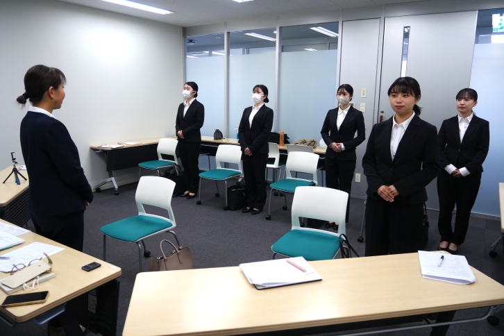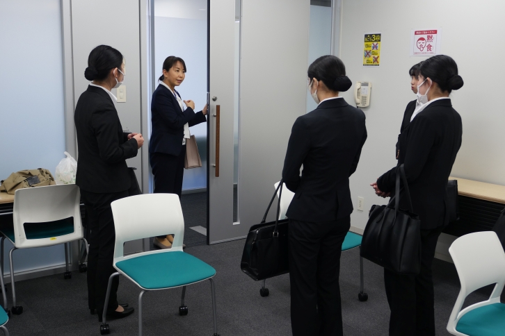 講座では、小グループに分かれて入室から退室までの一連の流れを丁寧に確認。お辞儀、姿勢や話し方といった基本動作を繰り返し練習しました。
