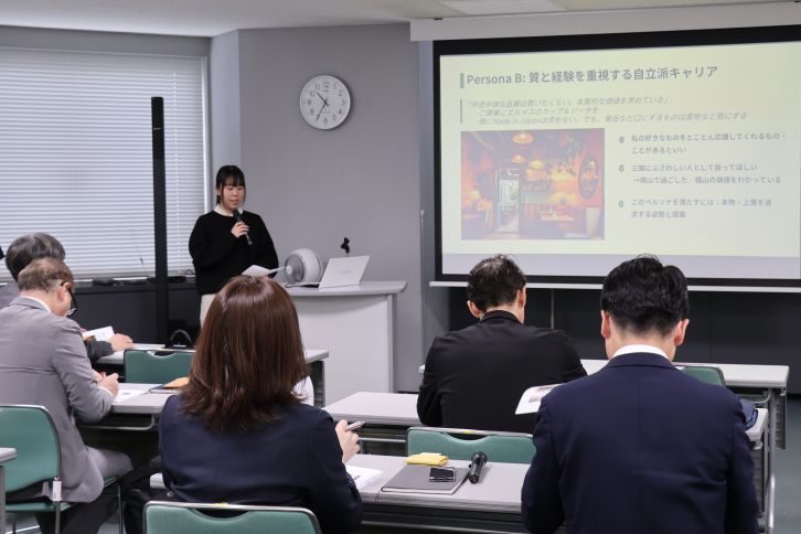成果報告会では、調査方法の説明に続き、インタビューの分析結果と、そこから見えてきた消費者の価値観が示されました。特に学生たちが注力した「インサイト分析」では、星ヶ丘三越を“高級・上質志向でありながら「目的買い・短時間・効率重視」”という形で利用者が多いことが判明。また、子どもの頃の思い出が将来の行動に影響するなど「百貨店は記憶をつくる場所」と感じている人が多い点や、「贅沢ではなく、自分への前向きな投資」をしたいという現状では満たされないニーズがある人がいることも明らかになりました。