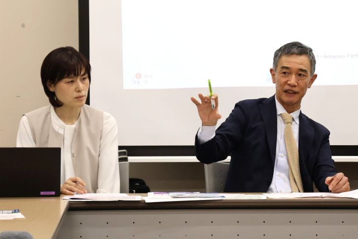 当日は、名古屋都市センターを運営する公益財団法人名古屋まちづくり公社の坂廼辺浩主幹と企画課の山下寛子氏が来学。ゼミ生に加え、新聞報道部の新入部員も参加したガイダンスでは、名古屋都市センターの役割やInstagram発信の目的、コンテンツの制作・投稿の流れについて説明がありました。あわせて、写真や動画を撮影する際の注意点、事実確認の重要性、公的機関のアカウントとしての責任などが共有され、個人のSNSとは異なる意識をもって発信することの意義が強調されました。